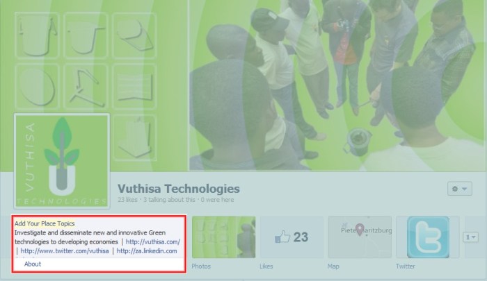 According to Social media expert Mari Smith (http://www.marismith.com/) the ‘About’ section in your Facebook profile actually contains the meta description for your Page so make sure it has your keywords. Construct a nice little write-up about what your business does or how it came into being with a clickable website. Also see these useful guidelines: http://www.socialmediaexaminer.com/facebook-101-business-guide/