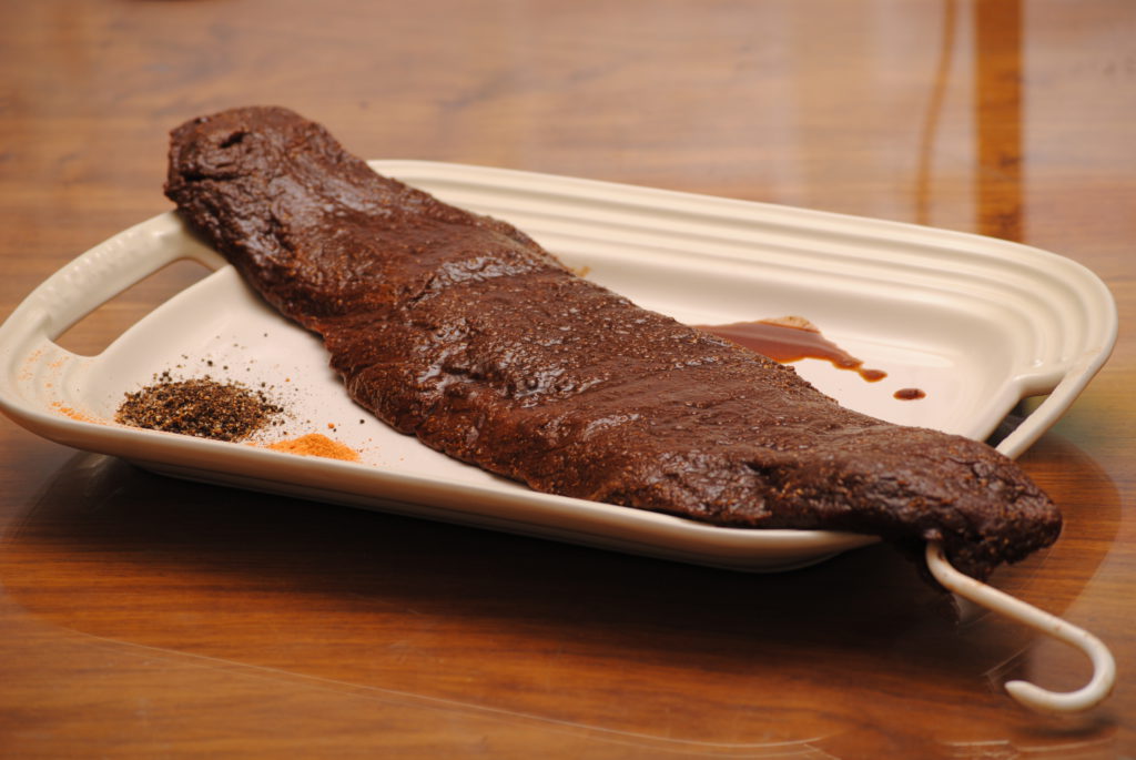 The biltong we created was fan dried with a bit of heat from a small convection oven contained inside a filing cabinet converted into to a smoker and temporarily converted into a biltong maker. The biltong was hung from a hook and dried for 24 hours, at around 30°C.