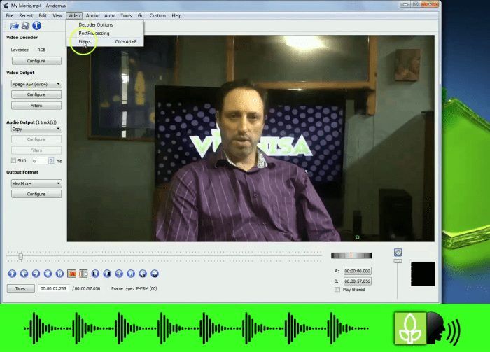 Step 5: Open Avidemux again and open the file created in Windows Movie Maker, but it should still be open as we created a still image earlier from the same video. Select VIDEO OUTPUT> Mpeg4 ASP (xvid4) on the drop down menu on the left before you do anything else. Now select VIDEO> FILTERS from the top menu bar. Double Click on ADD LOGO then >SELECT and upload the PNG file you just created. Move the image around as shown to ensure there’s a thorough coverage over all edges of the template. Close that window. On the main screen you still wont see the border created, so first tick the box SHOW FILTER. Press play and the filter you added can be clearly seen! Click FILE >SAVE and the file will save as a MKV file, which is the extension for Avidemux. You already selected video output as Mpeg4 earlier, but although it applies all the filters and saves it in Mp4 format the file extension remains MKV.