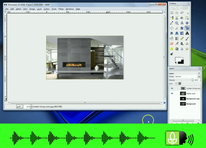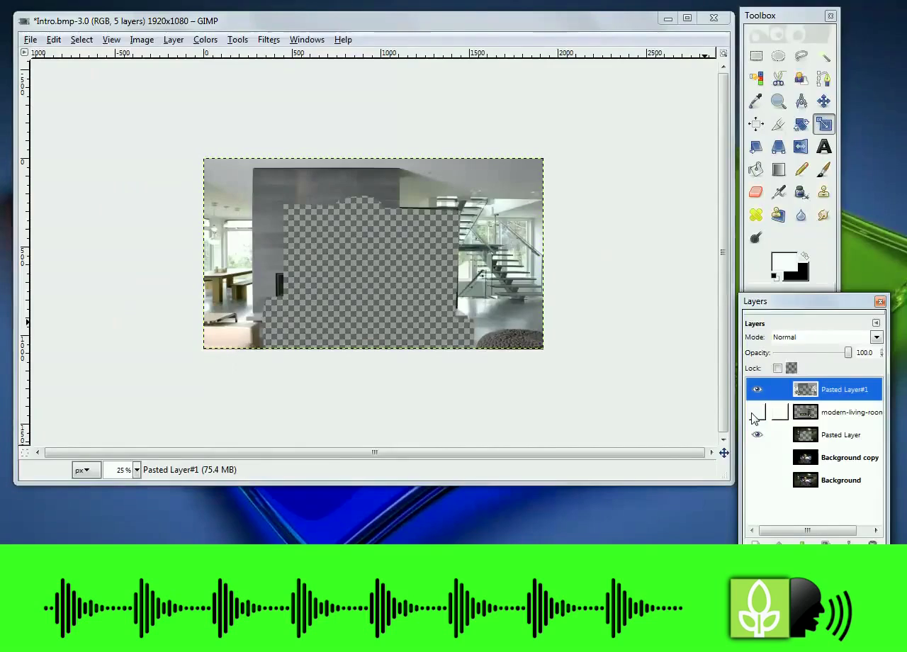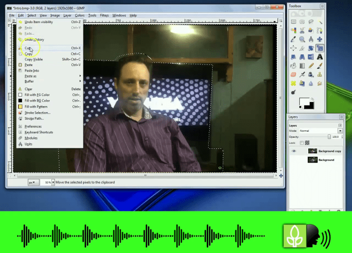 Step 4: Start up your favorite image editing software, I used Gimp, and open the the image still-shot just created. Here I am showing in Gimp how to create the background image. Before starting this process make sure the background image is looking tip top. In Gimp I go to COLOURS> LEVELS and set the LEVELS to AUTO to bring out a more vivid image. Carefully crop around items on your image you want to LEAVE in the video. We want to create a border but leave some items or features inside the video display. Cut and past the border to a new Layer. You are now left with a border that will be eventually layered over the video to hide the background on your current video. In Gimp I have to “Add an Alpha channel” to highlight background image as a shape and not by colour pixel, which ensures transparent area is saved as see-through and not a white background. To ensure the transparency is achieved we have to save the border or background as PNG file.