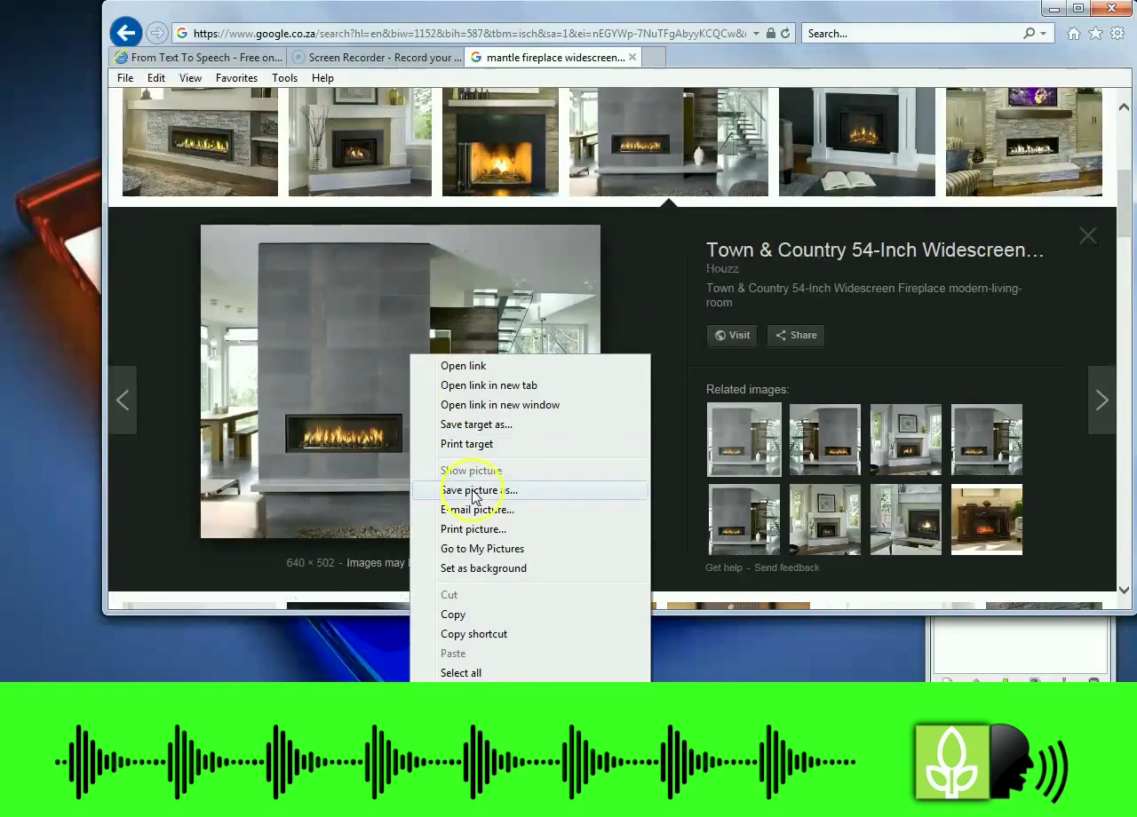 Step 1: Browse the web for an appropriate image background on Google image search. Search for “mantle fireplace widescreen” or similar search phrase under the images tab. Download the image by Left click, let it load, then RIGHT CLICK >SAVE PICTURE AS to a new folder you created on your PC, Laptop or Mac.