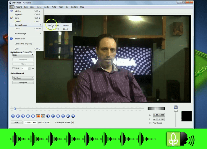 Step 3: Download Avidemux, an awesome free video cropping and editing software and open it up. See the link to download this application at the bottom of the post. Import the Mp4 file created in Windows Movie Maker into Avidemux. Start playing the video and stop it at any point of the video. Go to FILE> SAVE IMAGE> AS BITMAP and save it to the same folder you created earlier.